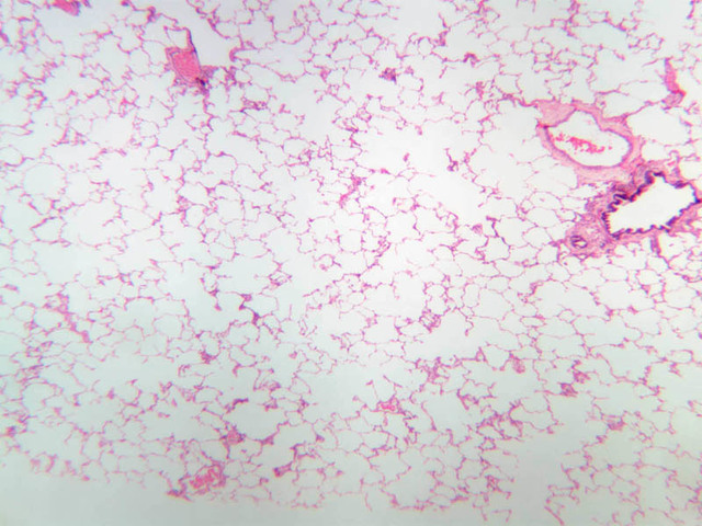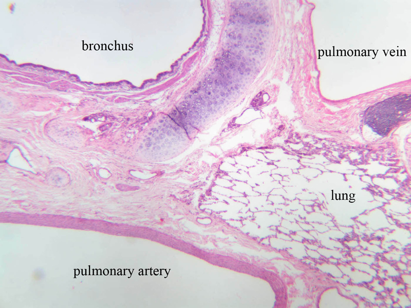 Orientation: Before attempting to examine the class set specimens, first review and study lung morphology in your text and atlas. Understand the morphology and relative size of 1) bronchi; 2) bronchioles; 3) respiratory bronchioles; 4) alveolar ducts; 5) alveolar sacs; and 6) alveoli. In these micrographs, trace the passage of a molecule of oxygen from the bronchi to blood. Doing this beforehand will greatly facilitate examination of the specimens.