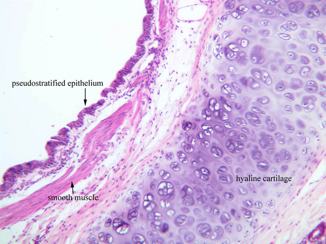The trachea is a continuation inferiorly from the larynx (slide A-72, PAS [2.5x, 10x, 20x, 40x-labeled] [2.5x-labeled, 10x, 20x, 40x]; A-75, H&E [2.5x, 10x, 20x, 40x]; A-76, H&E [2.5x, 10x, 20x-labeled, 40x] [2.5x, 10x, 20x, 40x]). It is notable for the C-shaped rings of hyaline cartilage which keep its airway open, for the lining of mucous-coated epithelium which serves as a trap for inspired particulate matter, and for the glands beneath the epithelium which help goblet cells of the pseudostratified epithelium supply mucous. The glandular tissue may also have a role in moistening inspired air.