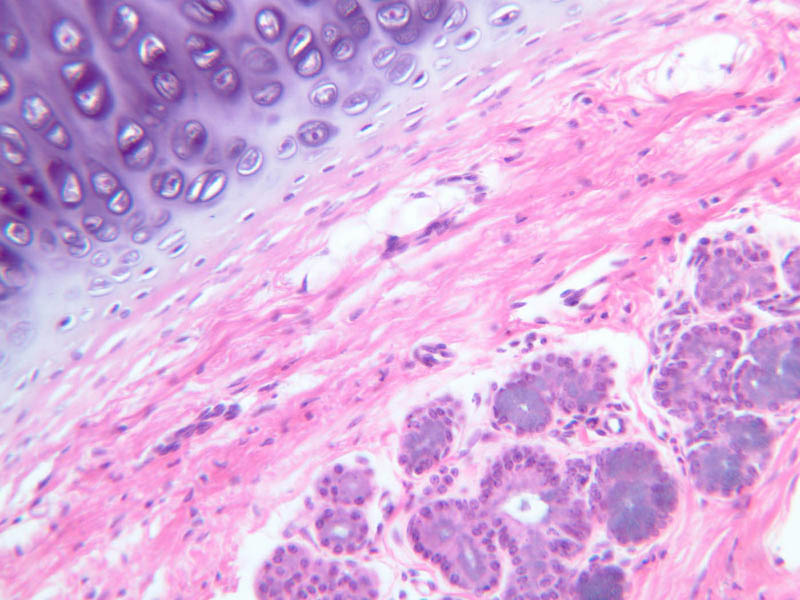 The larynx (A-73 [2.5x, 10x, 20x, 40x] [2.5x, 10x, 20x, 40x]) is kept open by a series of cartilaginous rings. Characterize the cartilage in the walls as to type and extent. The particular importance of the larynx is clearly demonstrated in its use for the generation of sounds. The lining epithelia, the fibrous elements of the vocal cords and muscles attached to the cords are adapted for this purpose. The respiratory epithelium of upper and lower larynx is replaced over the vocal cords by a thin stratified squamous epithelium. The body of the cords consists of skeletal muscle and elastic connective tissue. Numerous examples of both serous and mucous glands can be seen everywhere beneath the laryngeal epithelium except in the vocal cords themselves ([2.5x, 10x, 20x, 40x-labeled]). Occasional lymphoid nodules may also occur ([2.5x, 10x, 20x, 40x]).