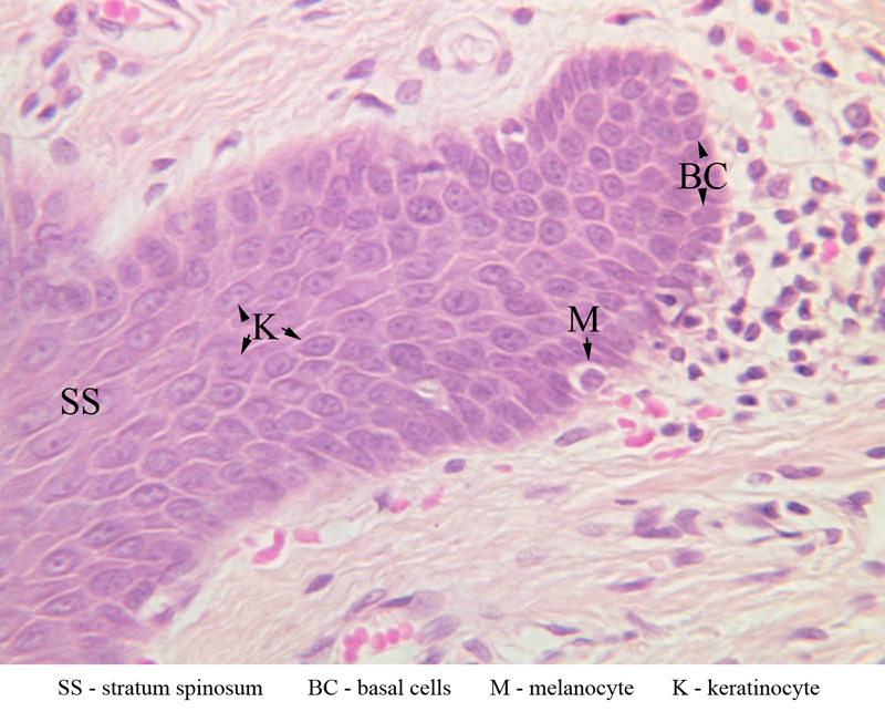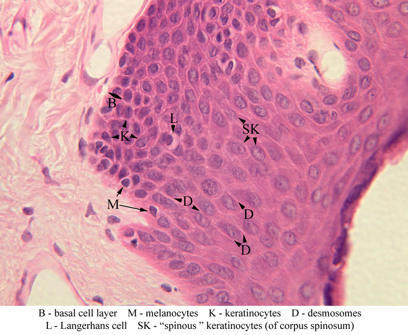 the epidermis. The keratinocytes exhibit morphological and functional stratification from