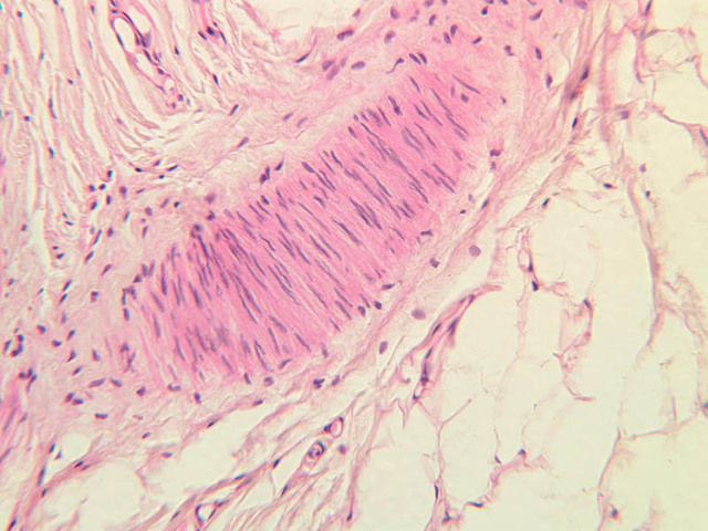 40x]). The sectioned appearance of the Pacinian corpuscle resembles a slice of onion, consisting of numerous