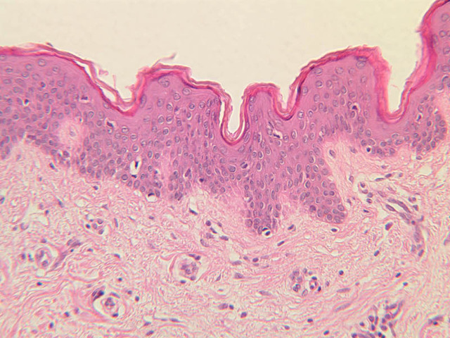 squamous epithelium) and dermis (a connective tissue layer beneath the epidermis). Epidermal ridges project into the dermis, enclosing between