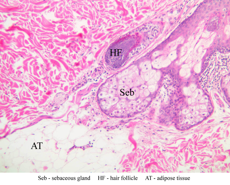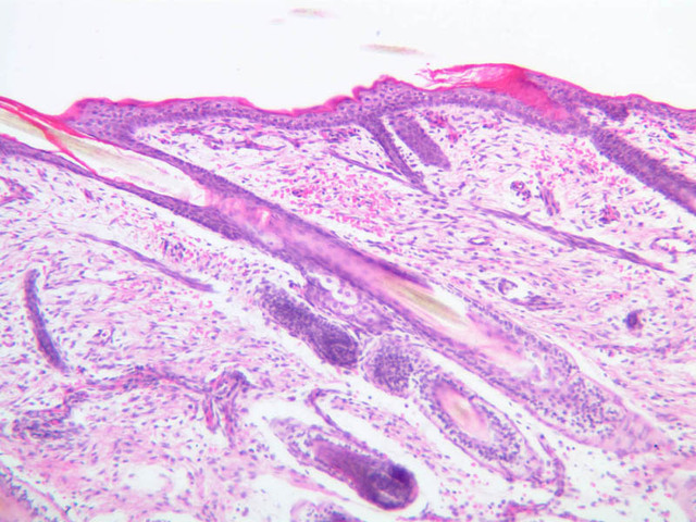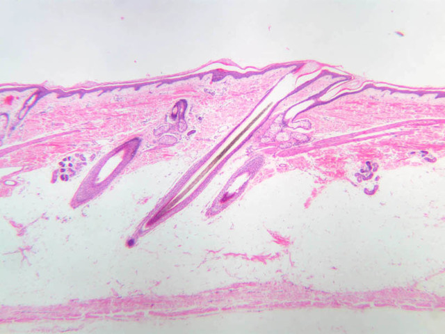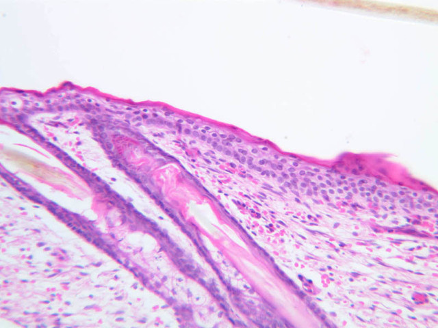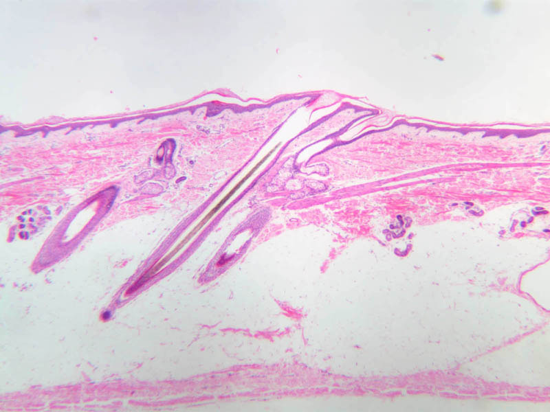 All the epidermal layers in this skin are thin, the stratum lucidum is not apparent and the