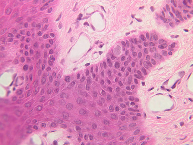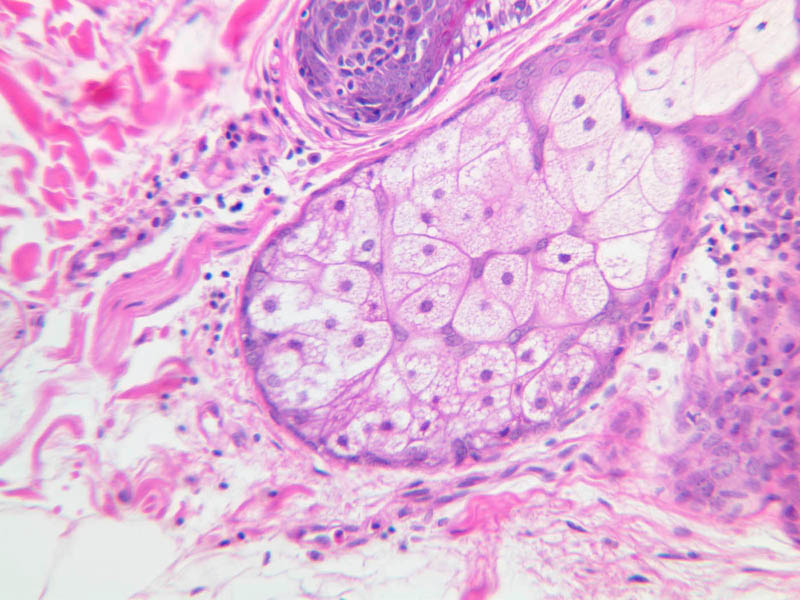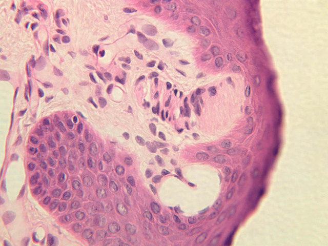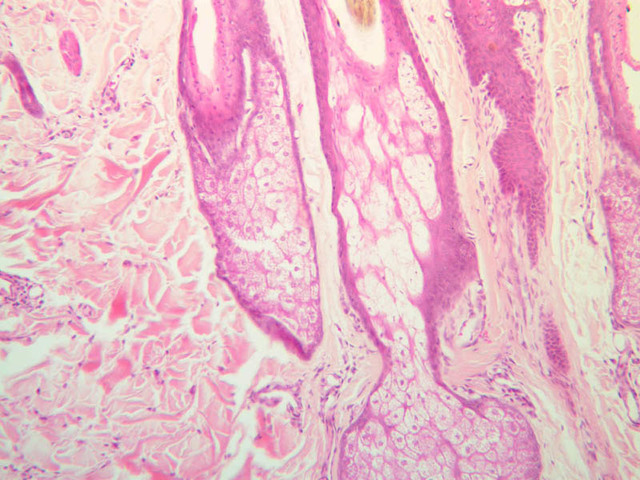 40x]). Clear cells occurring among the basal epidermal cells may represent melanocytes that have transferred their pigment granules to the epidermal cells.