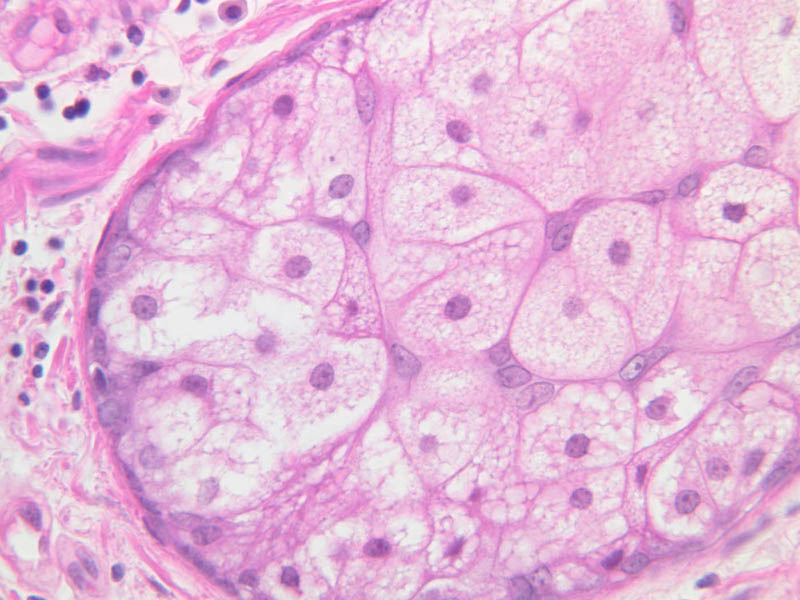 Superficially similar clear cells lying in the upper spiny cell or granular cell layers might